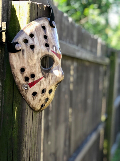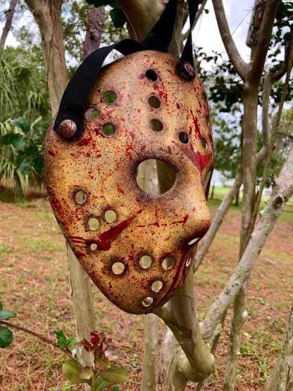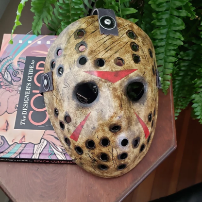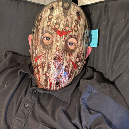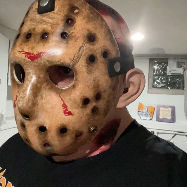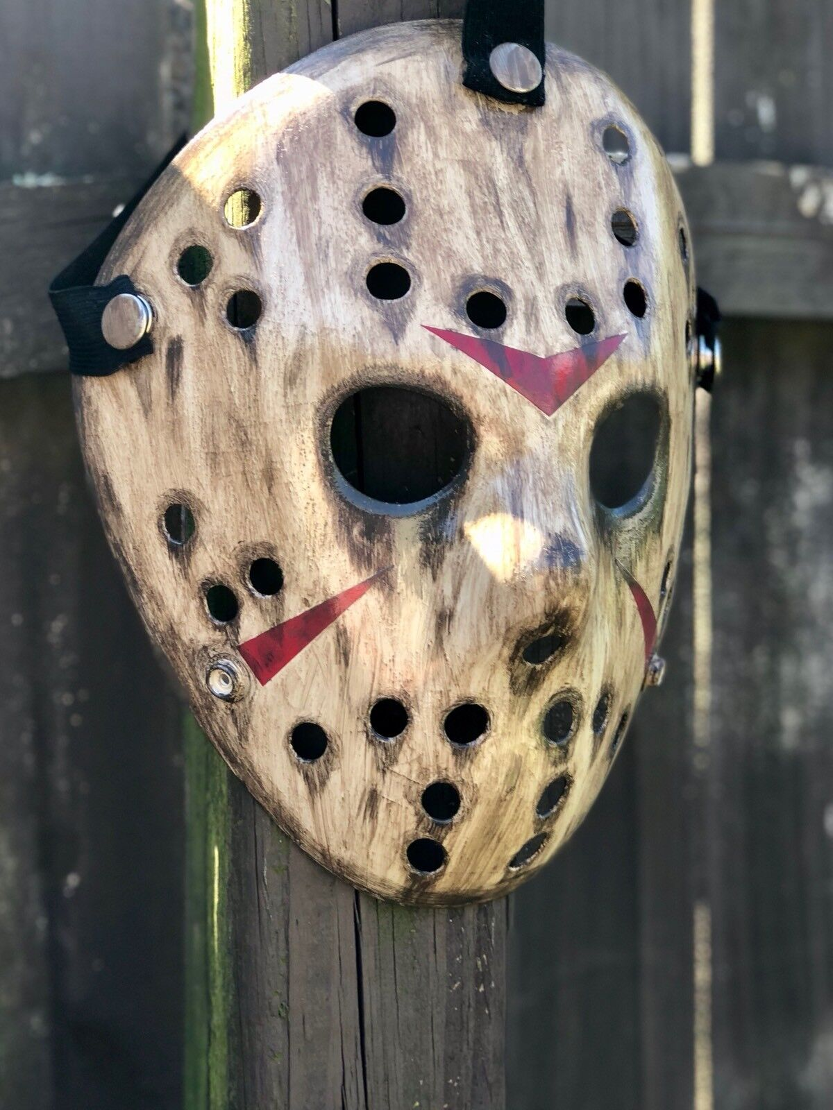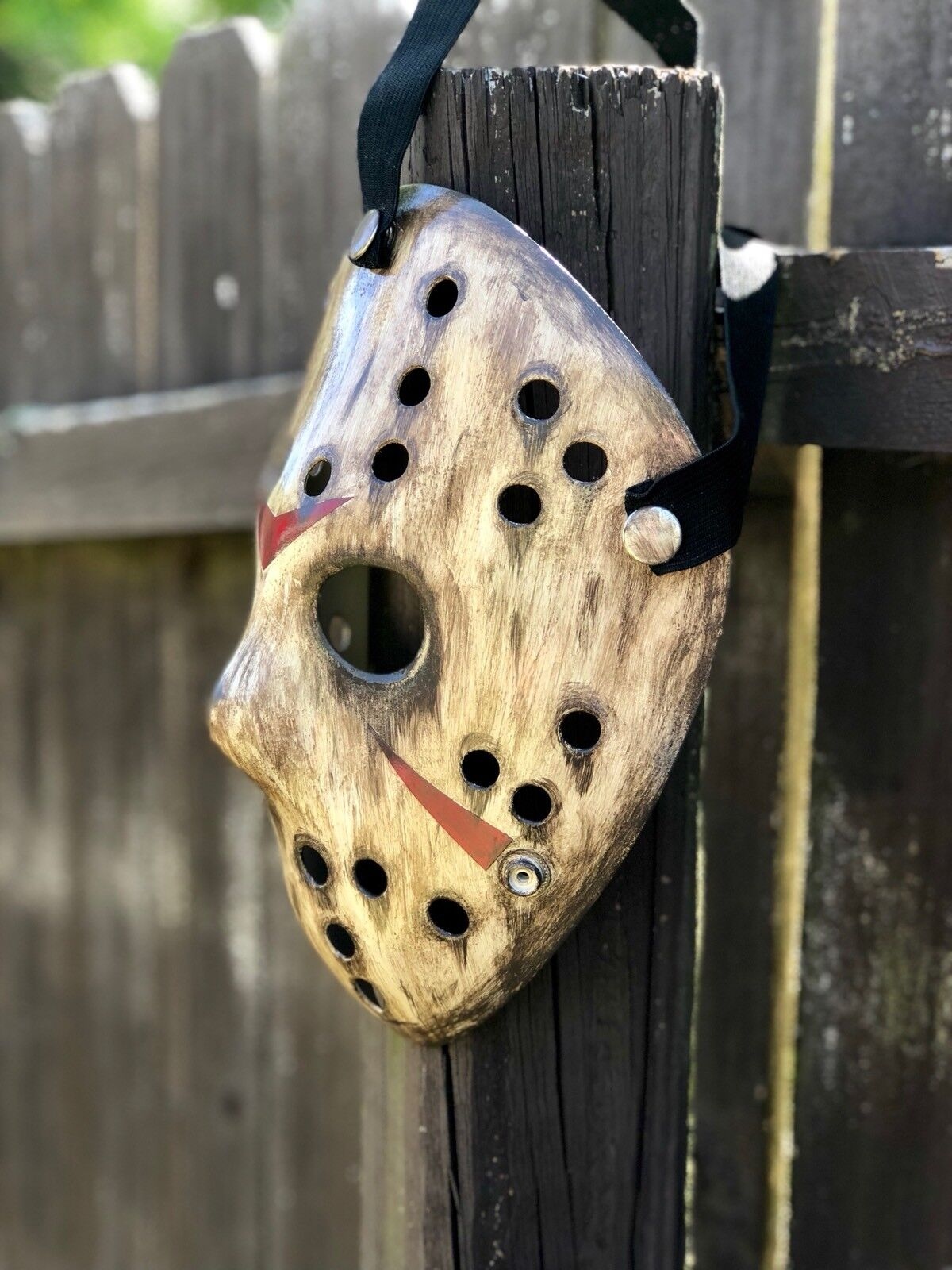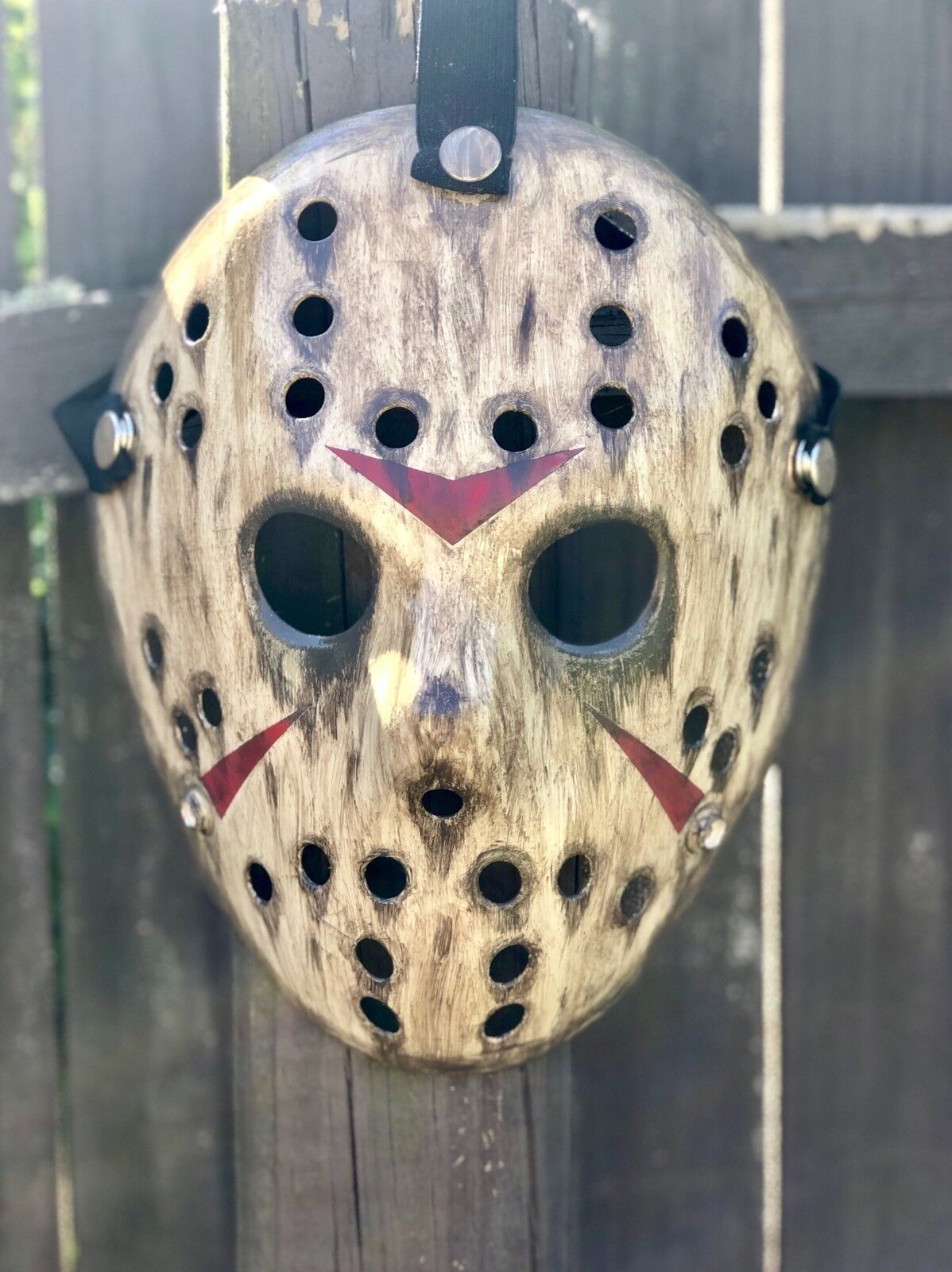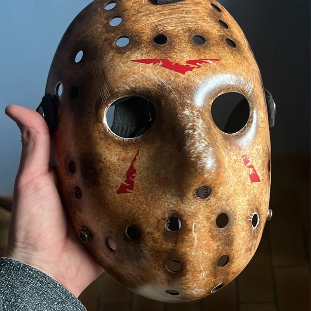 Black rubber straps to grip head, snap buttons design for quickly fasten and unfasten Jason mask; Has extra buttons on the bottom, you can switch the straps to for a smaller head from 13-14 year old teens.