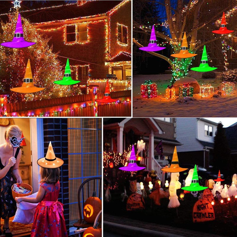 The perfect combination of Halloween witch hats and warm string lights make it is in a class by itself. It not only can be used as home decoration but also hangs on the tree, garage, eaves, porch, roof.