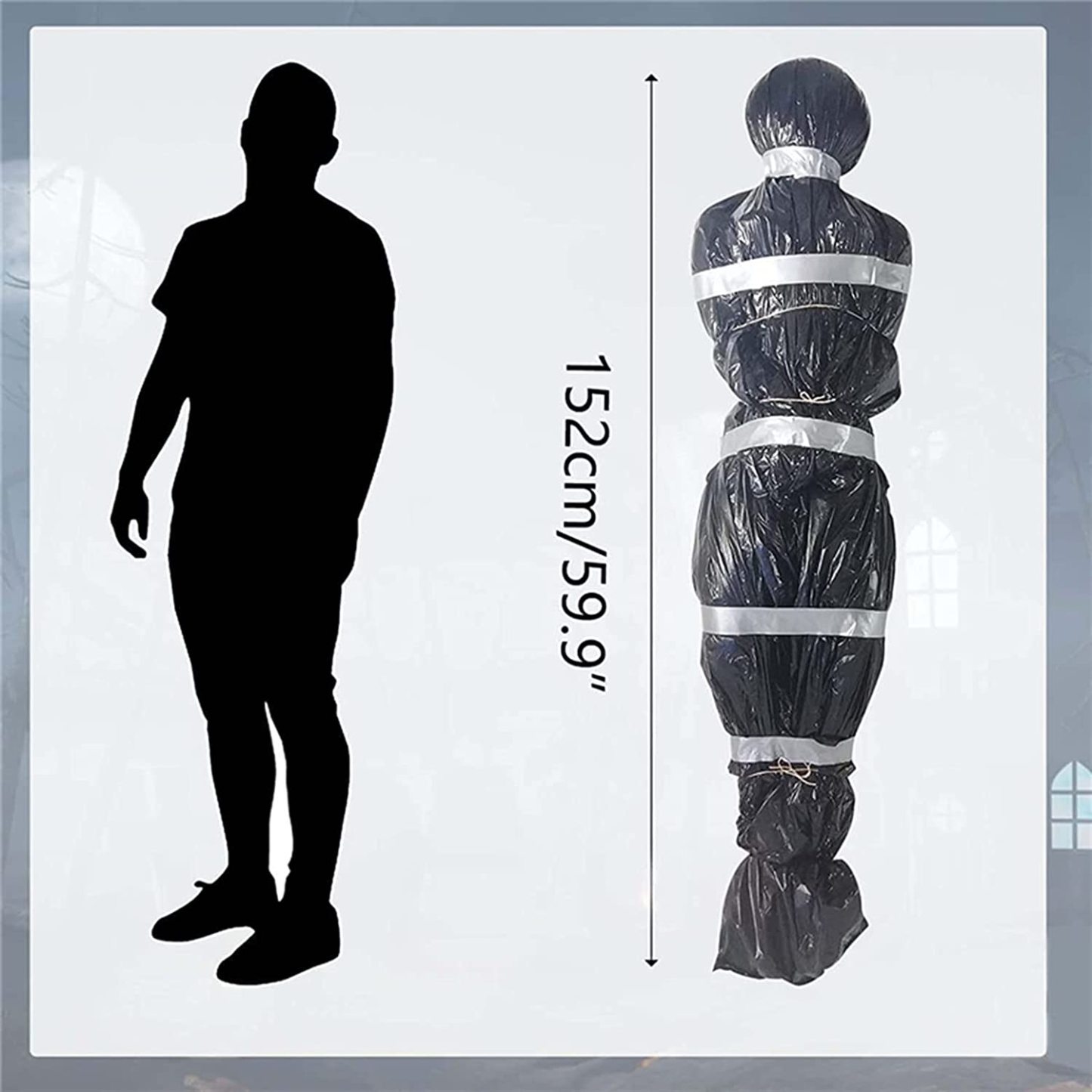 👻【Assured size】Dead victim prop size is 153cm/60inch Hanging corpse looks Reality, black PE bag 60*170cm/23.6*67inch, silver tape 10M/33Ft, hemp rope 10M/33Ft; plenty of materials to decorate yours with confidence Halloween Horror Night.