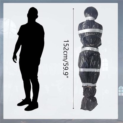 💀【Easy and quick assembly】 Fill the inflatable prop with gas, put it inside our black PE bag, fix it with hemp rope, then wrap it with silver tape at key parts, such as: neck, chest, waist, knees, ankles, etc . to highlight the shape of the human body, Look like a real person, and use leftover twine to hang the props anywhere you want to decorate.