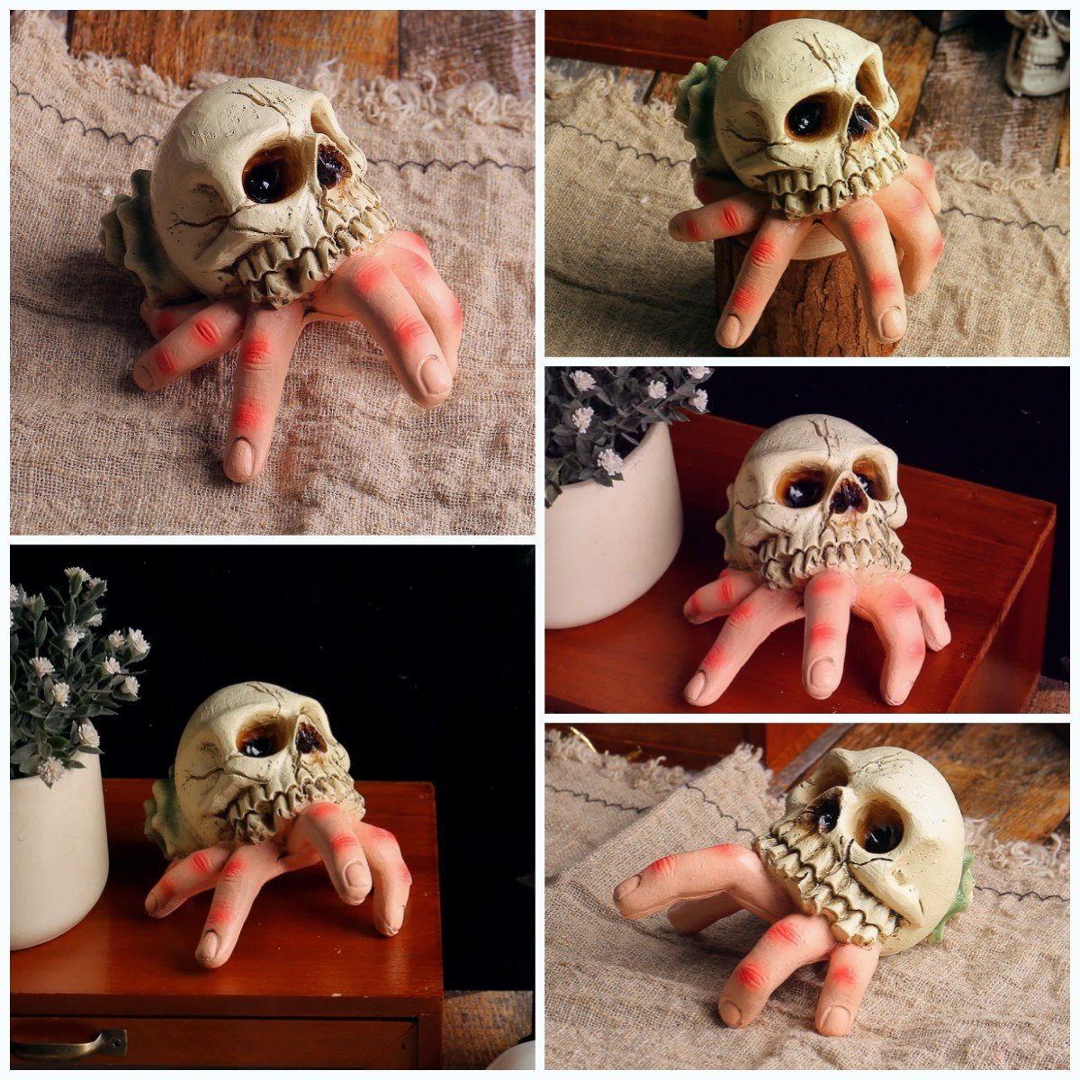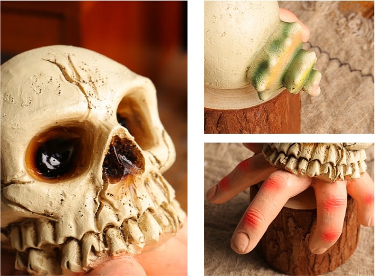 ⭐Realistic design - The combination of skull and simulated hand seems like an evil hand reaching out from the dark abyss, exuding an eerie aura. Every detail is meticulously sculpted, and the skeleton's hollow eye sockets and jagged finger bones all display a horrifying realism that sends shivers down one's spine.